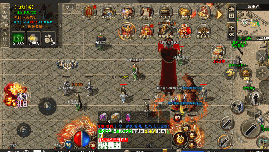 开启时间:开区100分钟后,持续3小时活动介绍:怪物攻城,怪物集体进攻封魔谷,额外刷新大量BOS并且会刷新两大超级BOSS,神秘蓝龙和神秘金龙,击杀B0SS后必爆高级剑甲,请大家踊跃参加!